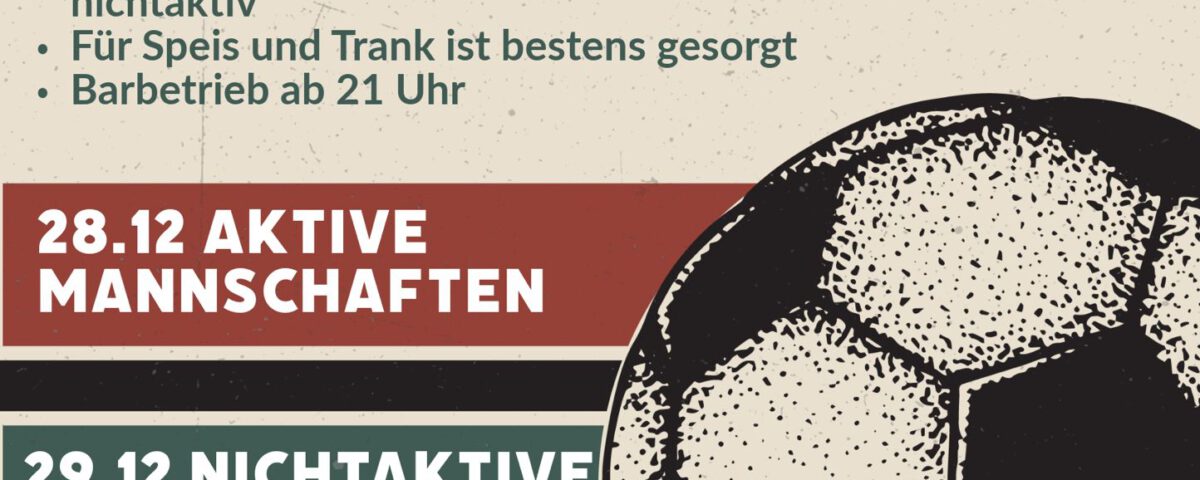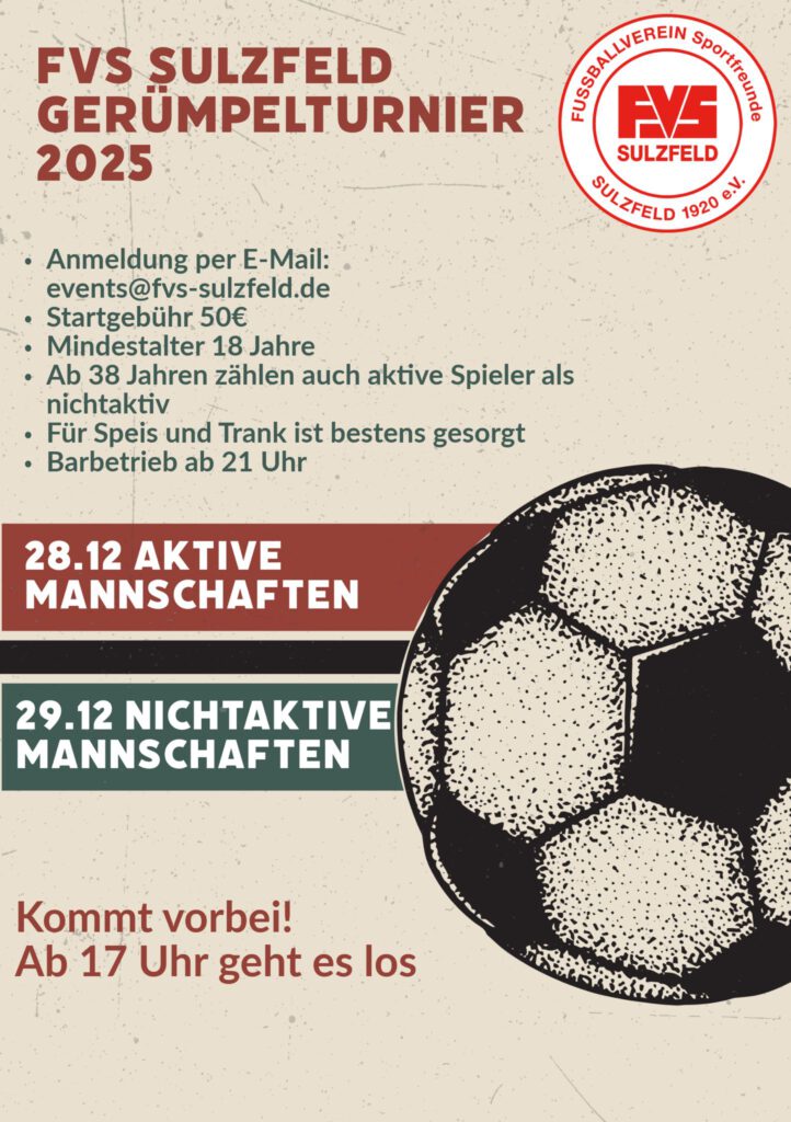 Am 28. & 29.12. findet auch in diesem Jahr wieder das Gerümpelturnier des FVS Sulzfeld statt. Alle Infos auf einen Blick …
